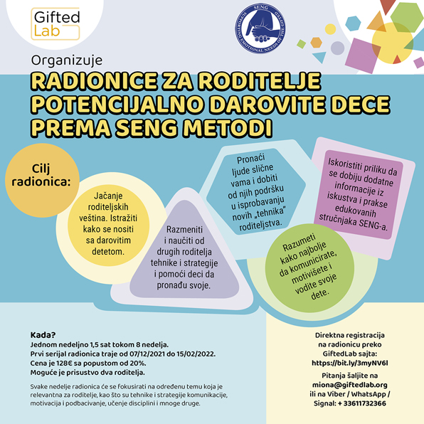 Roditelji se pozivaju da se unapred pripreme za SENG SMPG radionice. Imaju da pročitaju tekstove za domaći zadatak, temu po temu, tokom 8 sedmica dugačkog serijala radionica. Ova radionica osnažuje roditeljske veštine kako bi poboljšali self-koncept/pojam o sebi i emocionalni razvoj darovite dece.